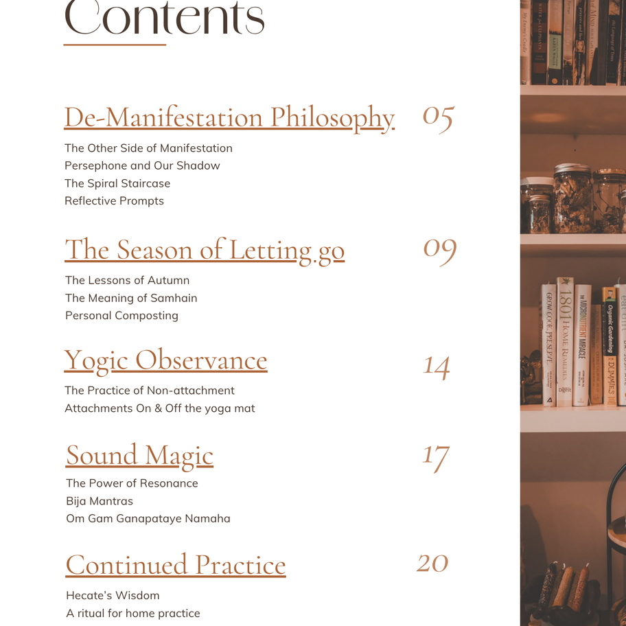 This 22-page guide explores de-manifestation through the lens of Samhain and the autumn season, weaving together yogic practices, the transformative power of sound and mantras, and the ancient wisdom of the goddess Hecate. A practical, mystical guide to letting go and stepping into clarity.